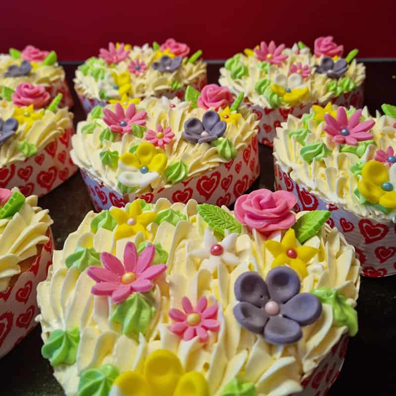 Zitrone Herzkuchen mit Vanille Buttercreme und Fondant Blumen dekoriert